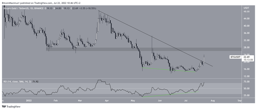 Курс BTG с 23 марта снижался вдоль линии нисходящего сопротивления. Начиная с мая, цена сформировала тройное основание, которое сопровождалось сигналами бычьей дивергенции по RSI. Тройное основание – это бычий паттерн, и динамика RSI еще больше повышает его значимость.