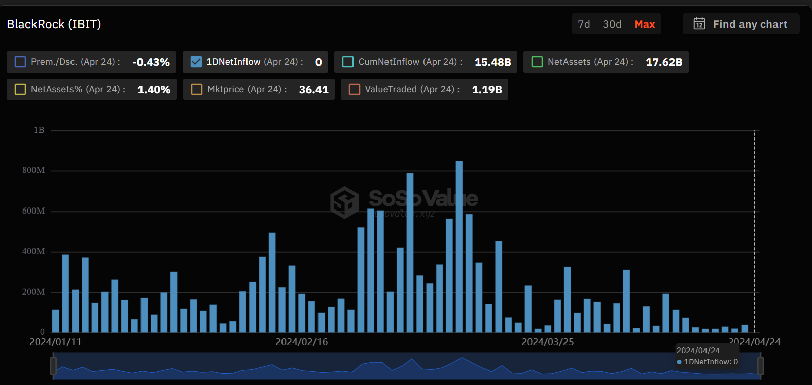 По данным SoSo Value, 24 апреля совокупный дневной отток средств из американских спотовых биткоин-ETF составил $120,64 млн. Фонд IBIT в последний отчетный день получил нулевой приток. До этого ETF от BlackRock держал лидирующую позицию среди конкурентов с непрерывными инвестициями на протяжении 71 торгового дня.