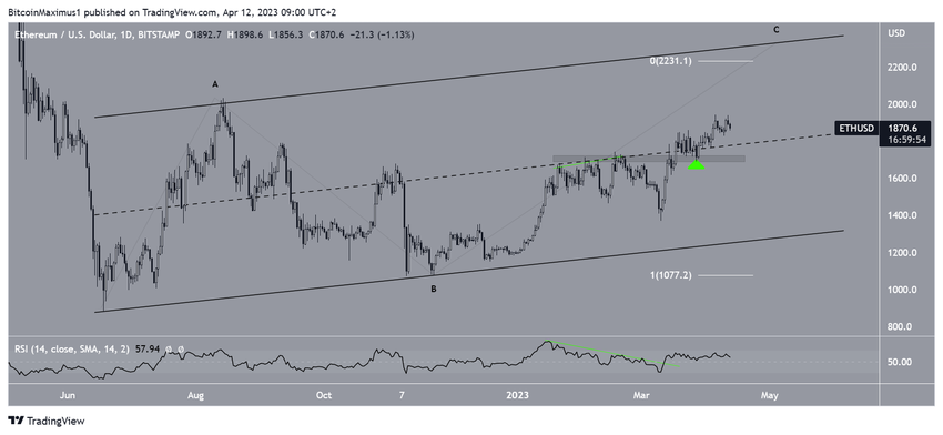 Кроме того, с июня 2022 года цена находится внутри восходящего параллельного канала, хотя его уровни поддержки и сопротивления не были в достаточной мере протестированы рынком на прочность. Тем не менее, срединная линия этого канала несколько раз сыграла роль сопротивления, подтвердив жизнеспособность паттерна. 4 апреля курс ETH прорвал срединную линию и в последующие 24 часа ощутимо укрепился. Если этот тренд продолжится, цена может достичь линии сопротивления в районе $2400.