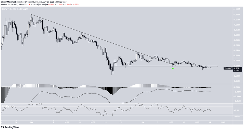 На более краткосрочном 6-часовом таймфрейме XRP совершил бычий пробой линии нисходящего сопротивления, которая присутствовала на графике с 1 июня. Впоследствии, 7 июля, цена протестировала этот уровень в качестве поддержки (зеленый значок).