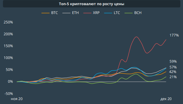 В ноябре биткоин подорожал почти на 43%, однако он сильно уступает другим цифровым активам по темпам роста. Так, например, ETH за ноябрь вырос почти на 59%, а XRP и вовсе на 177%. Впрочем, на момент написания материала последний актив уже скорректировался более чем на 40%.