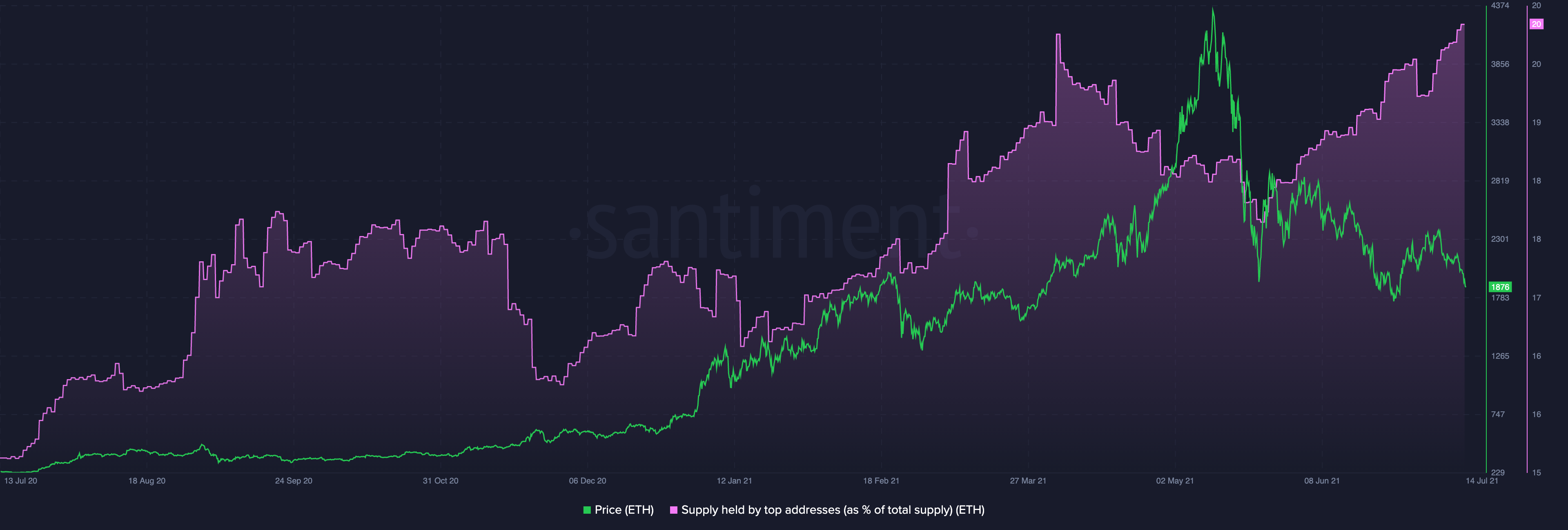 Текущий анализ также показывает, что первые десять кошельков накапливают эфир после недавнего падения с исторического максимума. После майского обвала цен топ-10 криптокошельков держали всего 18,46% эфиров.