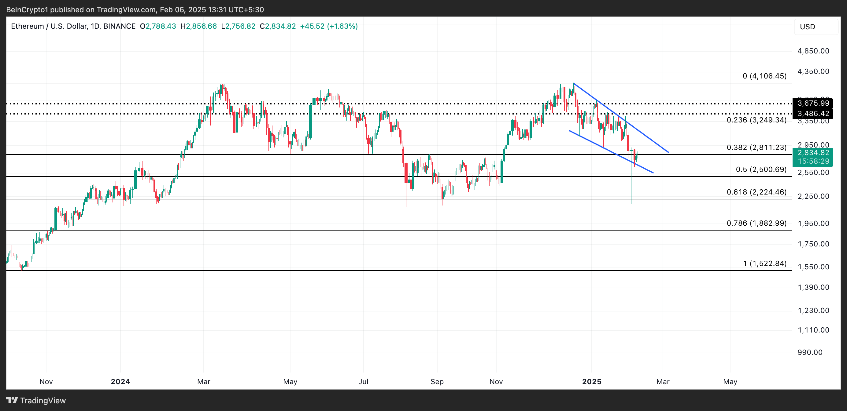 Обычно это сигнализирует о медвежьем тренде, но бычий прорыв из канала может стать сигналом о возможном развороте. Если спрос на ETH вырастет, такой прорыв может подбросить цену монеты до $3 249.