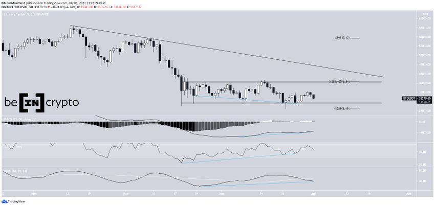 С 19 мая криптовалюта торговалась в диапазоне между $40 500 и $31 400. 22 июня BTC просел до минимума $28 805, а затем энергично отскочил от него.