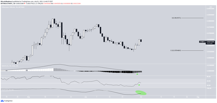 Краткосрочный график по ETH выглядит более бычьим. Кроме того, пара ETH/BTC подает сигналы бычьего разворота. Это указывает на более высокую вероятность того, что ETH окажется в июле успешнее, чем BTC.