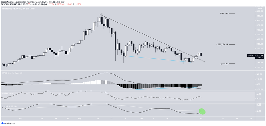 SponsoredВ результате 23 мая курс ETH достиг минимума на $1 730. Затем 22 июня рынок снова посетил эту область, сформировав тем самым двойное основание. Этот паттерн считается бычьим. Кроме того, его подкрепили сигналы бычьей дивергенции по MACD.