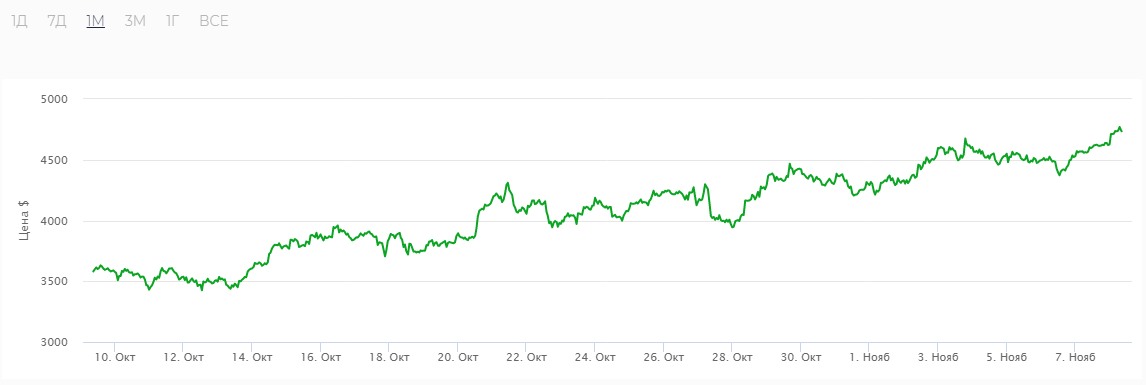 В понедельник, 8 ноября, цена второй по капитализации криптовалюты обновила исторический максимум. Новый рекорд вновь зафиксирован у BitMEX, где цена ether (ETH) в моменте подскочила до $4775 в паре ETH/USD. Рыночная капитализация криптовалюты увеличилась до $558 млрд.