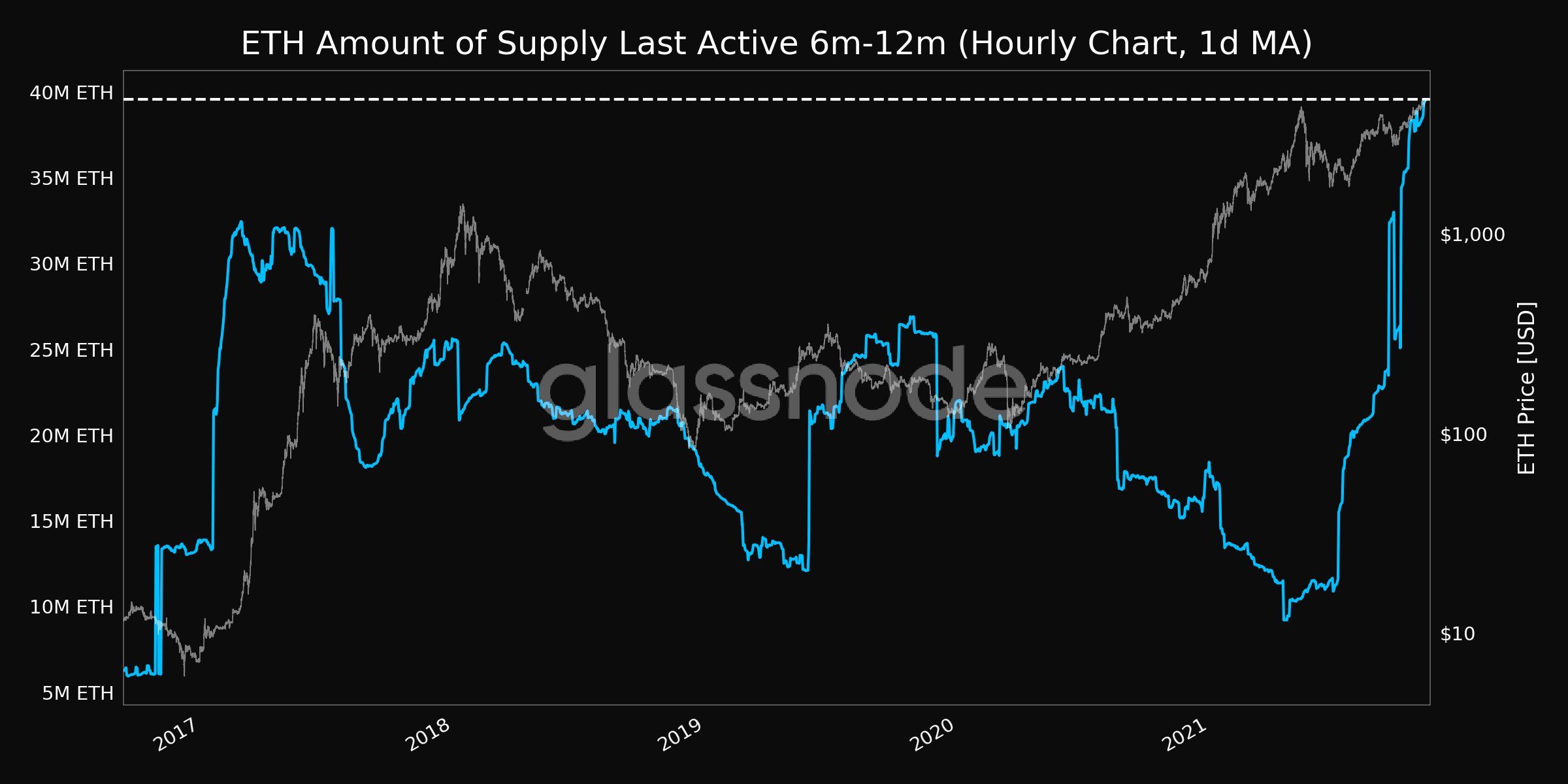 Объем активных монет, которые в последний раз перемещались лишь 6-12 месяцев назад, взлетел до 39 570 174 ETH. Это абсолютный максимум за последние пять лет. Однако, вопреки ценовым максимумам, комиссии в сети Ethereum остаются по-прежнему высокими. На момент написания материала средняя комиссия за перевод внутри Ethereum составляет ~$36.