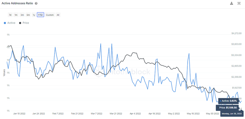 Число активных адресов в сети Ethereum быстро снижается по мере падения рыночных котировок. Об этом в блоге компании IntoTheBlock сообщил младший аналитик Педро Негрон. Он отметил, что с начала года активность адресов в сети Ethereum упала на 28% с 0,87% до 0,62%.