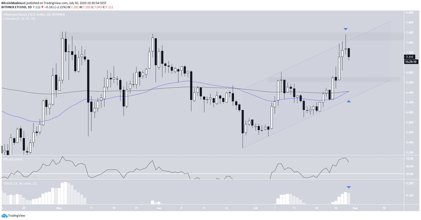На дневном графике видно, что, коснувшись этой зоны сопротивления, ETC сформировал свечу Доджи, которая считается медвежьим паттерном, когда появляется после роста.