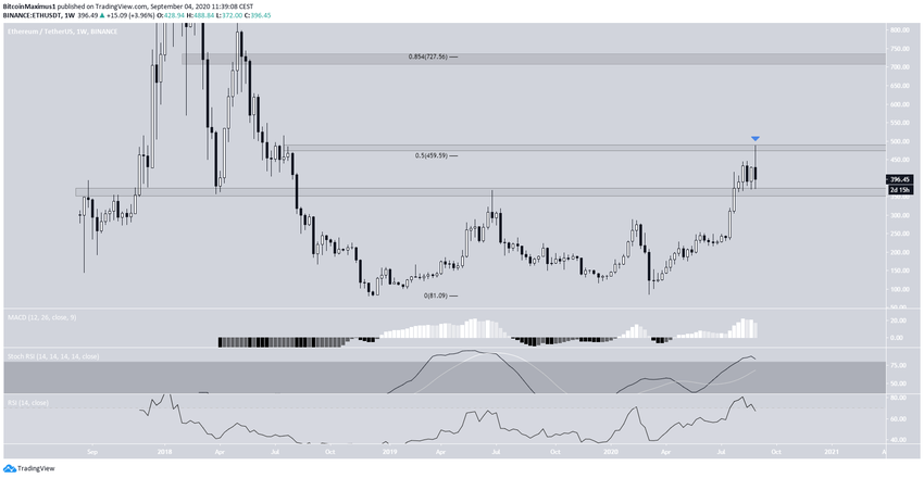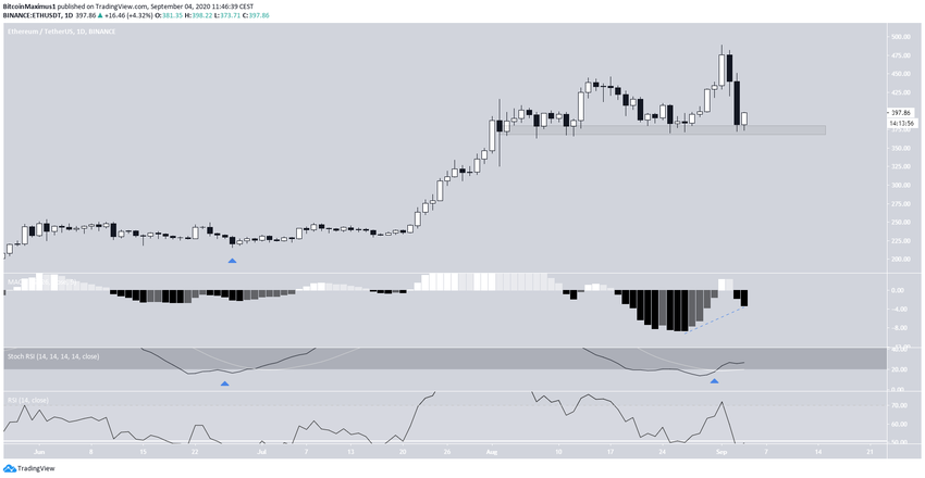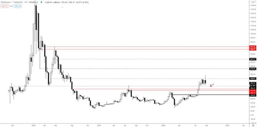 На дневном графике видно, что ETH торгуется в районе незначительной поддержки $395, которая остается актуальной с начала августа.