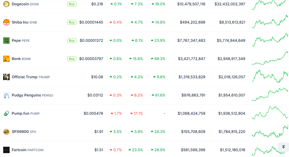 Некоторые мемкоины, включая Floki Inu (FLOKI), Bonk Inu (BONK) и Fartcoin (FART), демонстрируют двузначный рост. В то же время другие, такие как PENGU и PUMP, теряют позиции.