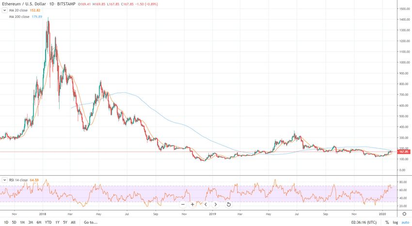 Ethereum укрепился в среду и коснулся отметки $170. С начала года ETH подорожал на 32%, поднявшись от минимума $128. За аналогичный перитод биткоин вырос в цене на 22%.