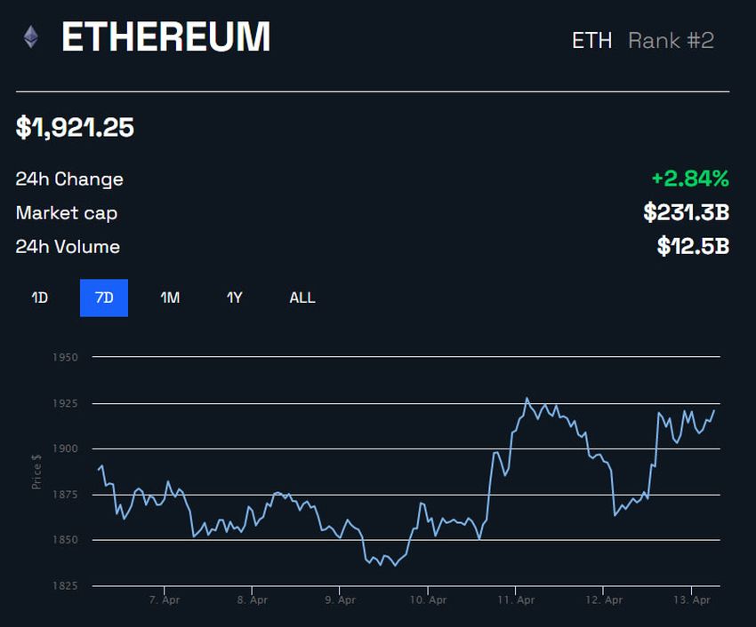 В результате на момент написания курс ETH торговался в районе $1920 с внутридневным повышением на 2,9%. При этом токен держится в непосредственной близости от 8-месячного максимума, отмеченного ранее на той неделе.