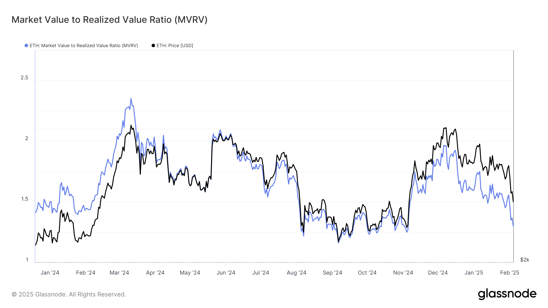 Между тем коэффициент MVRV остается в зоне бычьего разворота, предполагая, что ETH в данный момент не переоценен. Исторически, просадка этого показателя ниже 1,30 приводила к развороту цены.