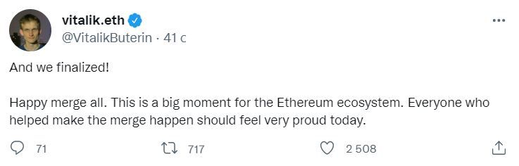 Соучредитель проекта Виталик Бутерин поздравил участников криптосообщества с успешным переездом ETH на PoS.