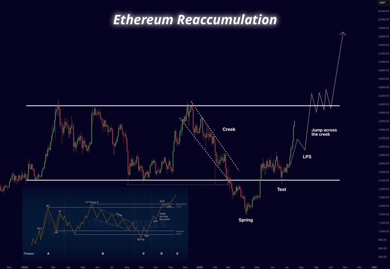 Трейдер Mister Crypto видит на графике криптовалюты фигуру теханализа «аккумуляция Вайкоффа». Выход из нее, по мнению автора, поможет криптовалюте прорвать уровень $5 000 в октябре 2025 года.