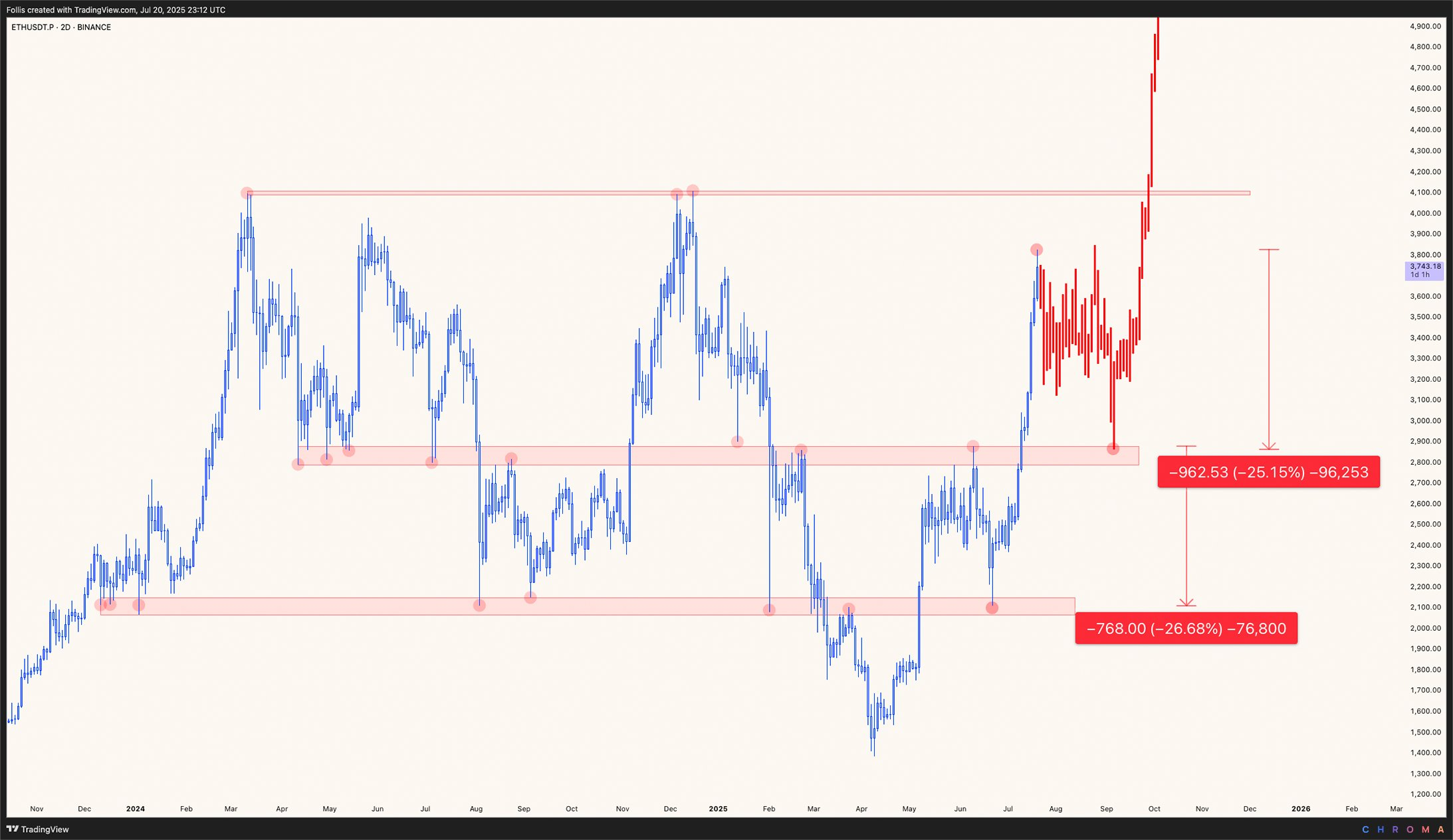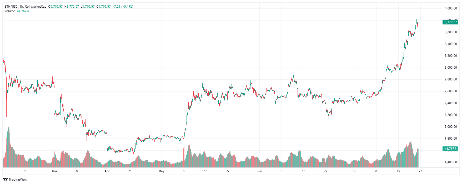 Ethereum активно растет с начала июля 2025 года. 20 июля монета обновила локальный максимум выше $3 800. На момент написания обзора, Эфир торгуется по $3 770, что на 23% ниже абсолютного максимума $4 891 от 16 ноября 2021 года.