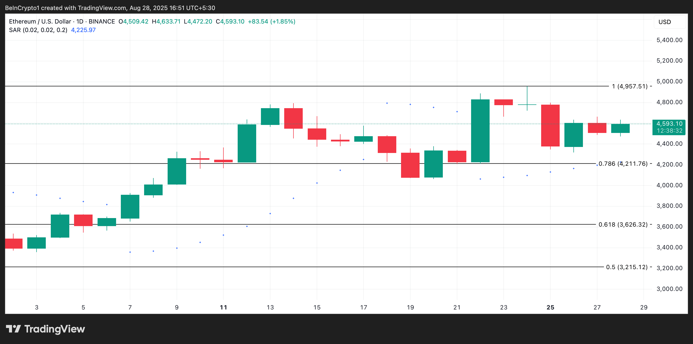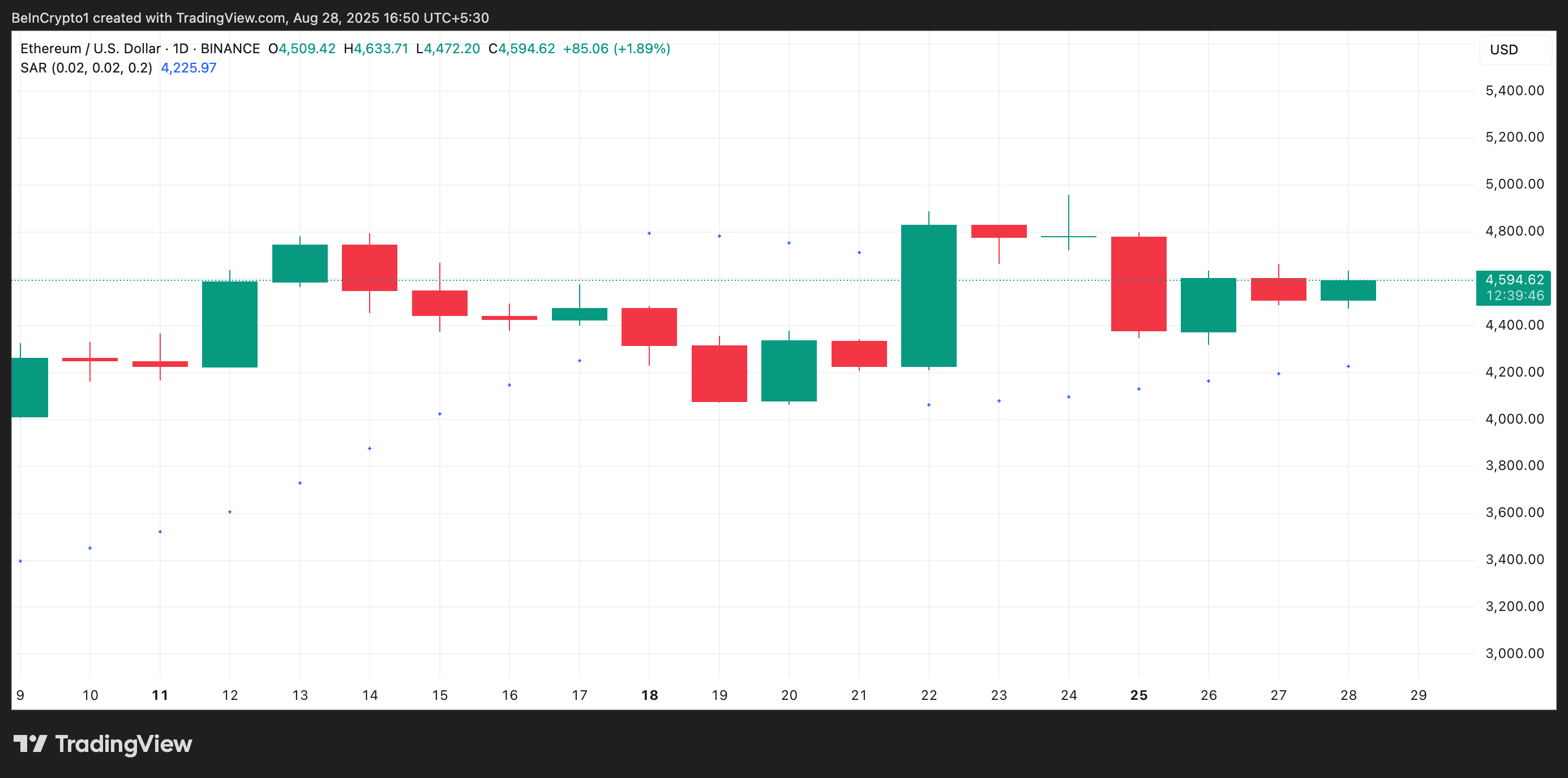 Дневной график ETH/USD тоже подтверждает бычий прогноз. На момент написания точки индикатора Parabolic Stop and Reverse (SAR) располагались под ценой ETH, обеспечивая динамическую поддержку на уровне $4 225. Индикатор помогает определять направление тренда и возможные развороты. Если точки находятся ниже цены, это сигнализирует о восходящем тренде и бычьем импульсе. При условии продолжения покупок это может привести к дальнейшему росту цены.