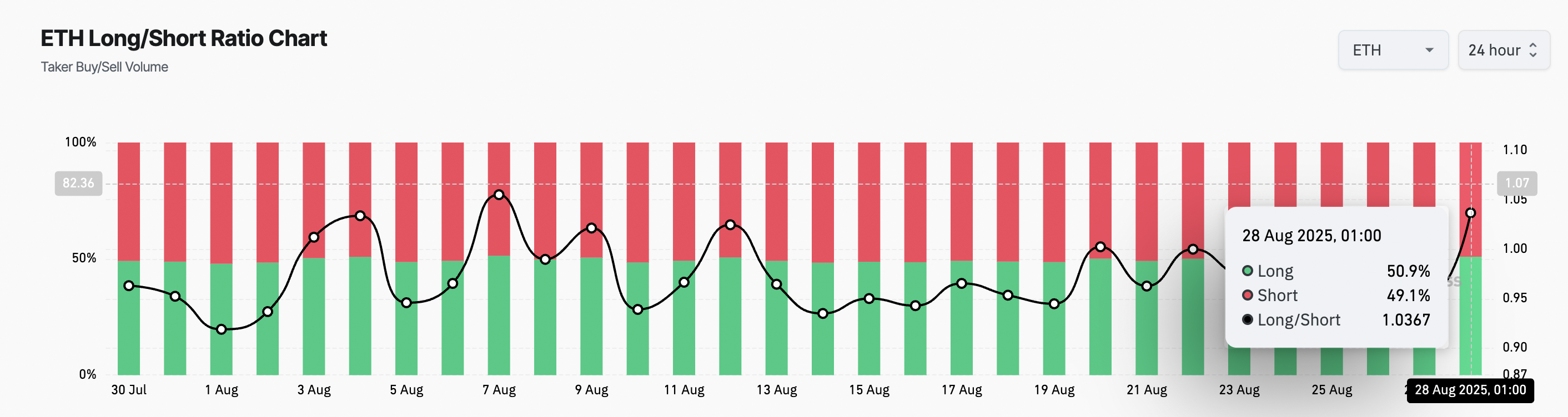 Соотношение длинных и коротких позиций по ETH превышает 1, указывая на преобладание лонгов. По данным CoinGlass, оно составляло 1,03 на момент написания. Метрика показывает баланс между трейдерами, ставящими на рост цен (длинные позиции) и теми, кто ожидает их снижения (короткие позиции). Текущее значение выше 1 говорит о том, что трейдеры на рынках деривативов поддерживают бычий импульс в сегменте ETF и надеются на скорый бычий прорыв.