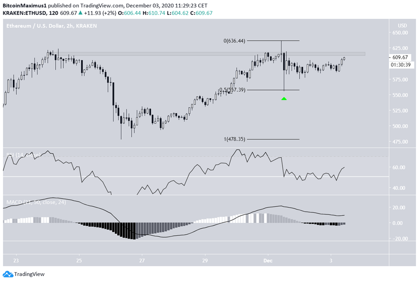 В настоящее время курс ETH приближается к первому важному уровню сопротивления Фибоначчи (0.382) коррекции от исторического максимума 2018 года, расположенному на $653.