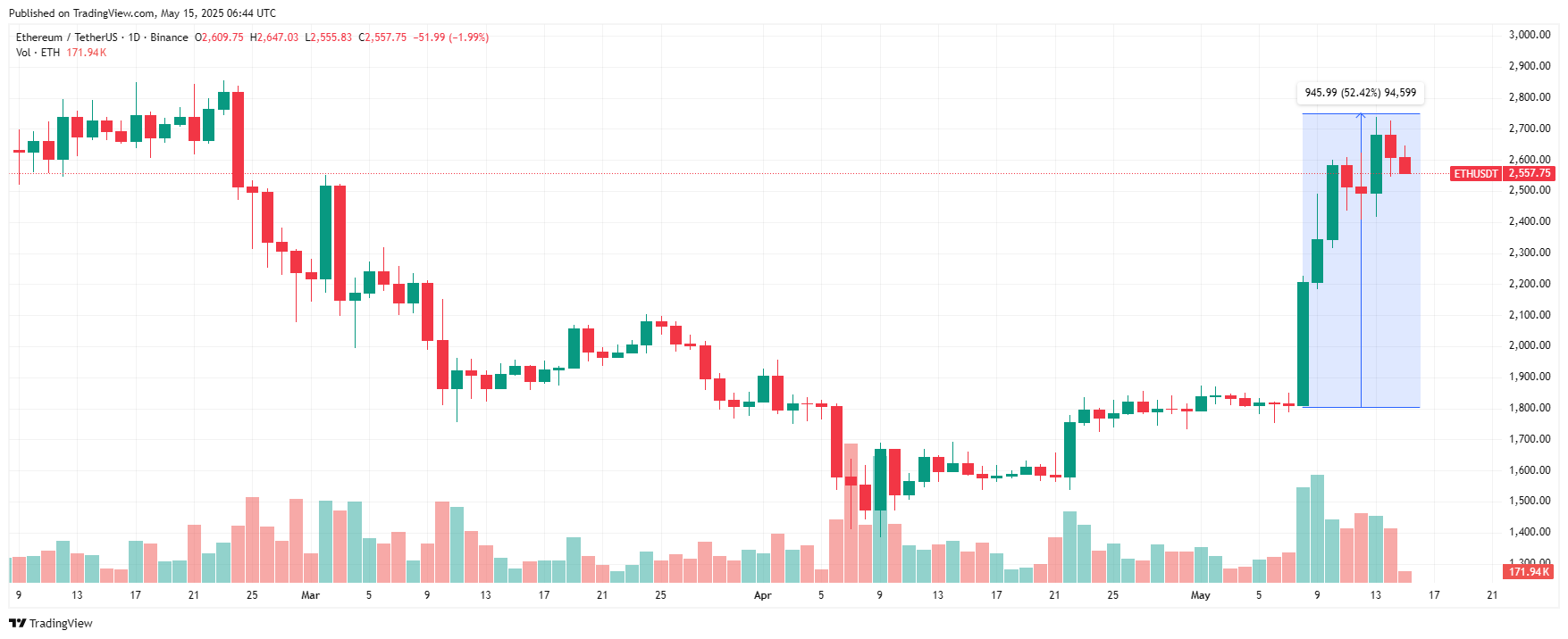 8 мая 2025 года Ethereum резко вышел в рост. К 13 мая рост криптовалюты превысил 50%. После ETH немного скорректировался. На момент написания обзора, монета торгуется по $2 557.
