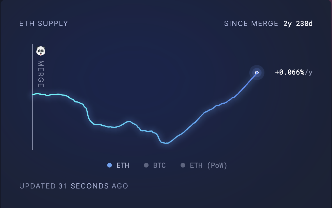 По данным на момент публикации, в обращении находится 120 730 199 ETH — это заметно больше, чем было до перехода сети на Proof-of-Stake. За последний месяц в обращение добавлено 72 927 ETH, что оценивается в $134 млн по текущим рыночным ценам.
