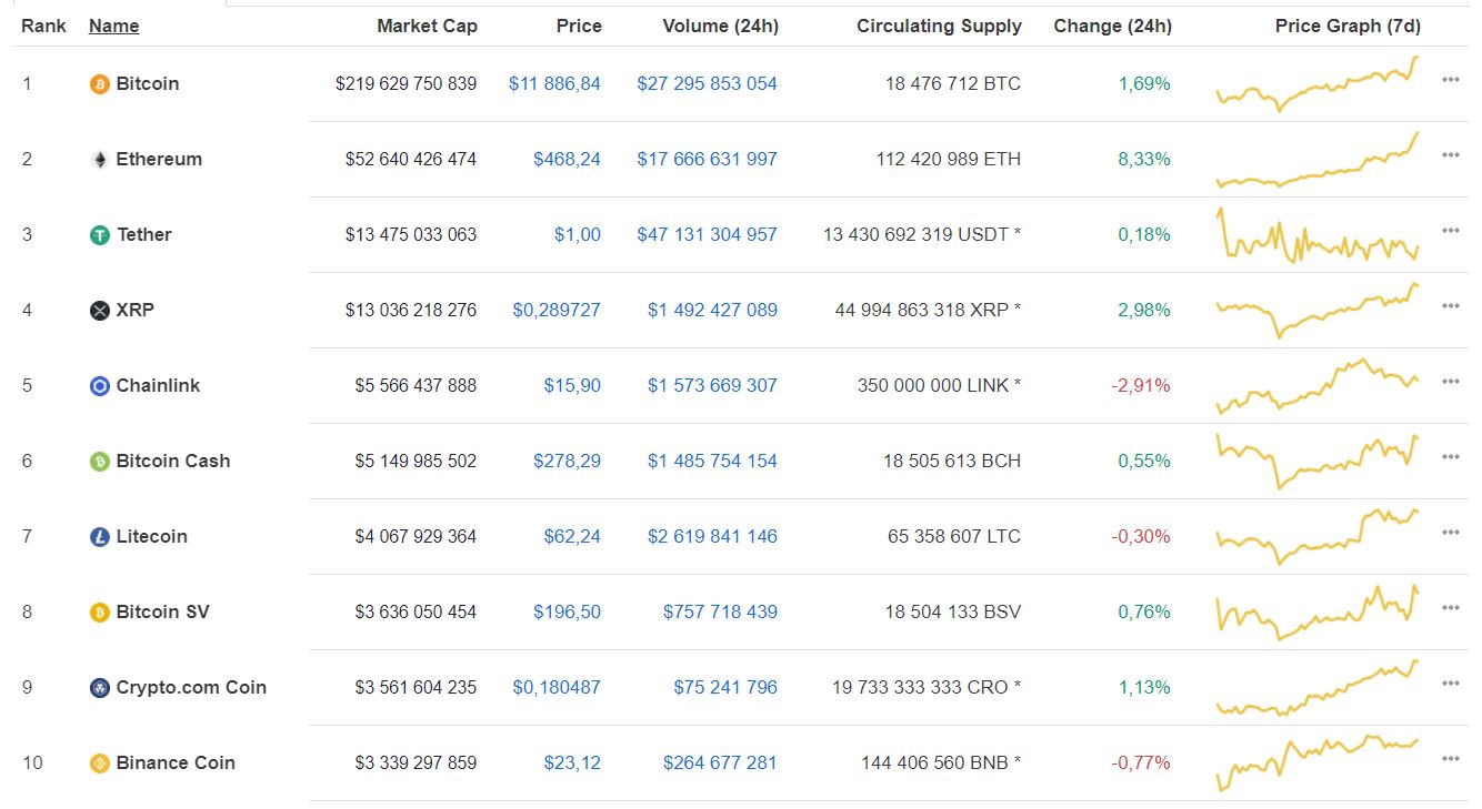 По состоянию на 15:09 (МСК), биткоин (BTC) торгуется по $11 886. Суточный рост актива составил 1,69%. Лучший результат позитивного движения зафиксирован у Ethereum. За 24 часа криптовалюта подорожала на 8,33%.