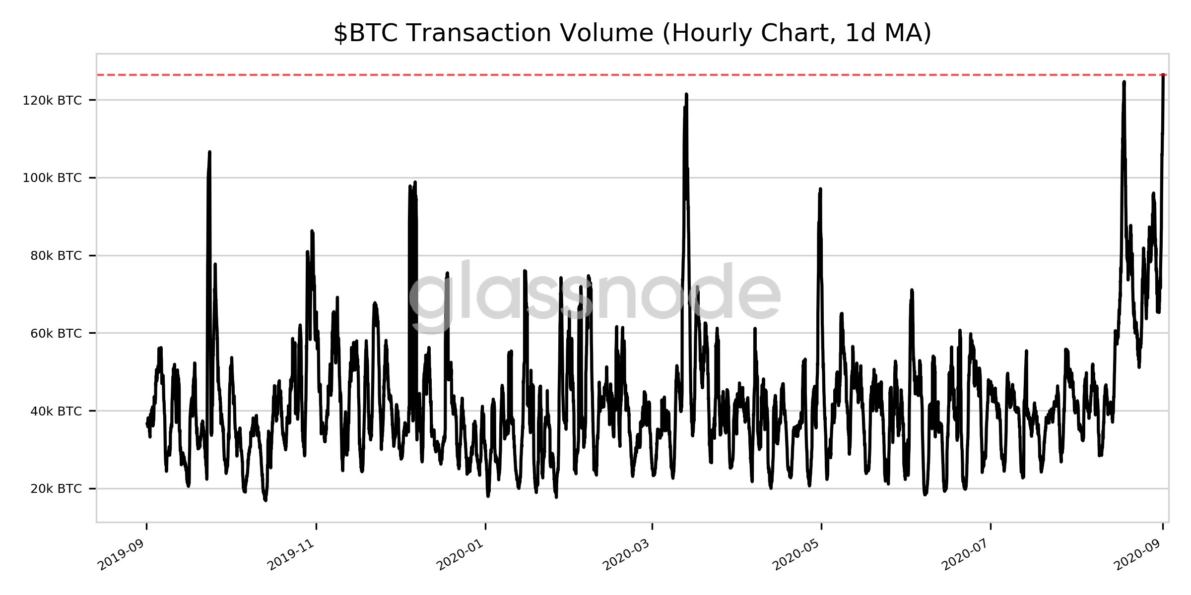 Параллельно изменения зафиксированы на графике, который отражает среднесуточный объем транзакций с биткоином. Показатель обновил годовой рекорд на уровне 126,427.117 BTC.
