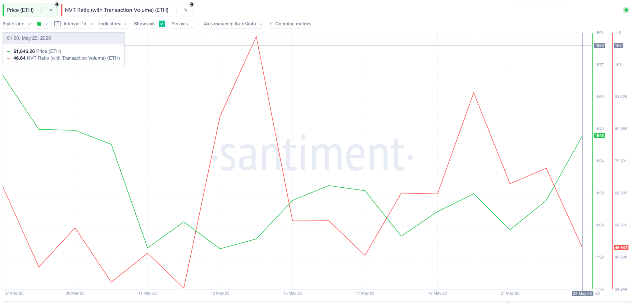 Показания ончейн-индикатора NVT говорят о том, что в настоящее время Ethereum недооценен. На графике ниже видно, что в период с 20 по 22 мая значение индикатора упало на 49% — с 92,92 до 46,64.