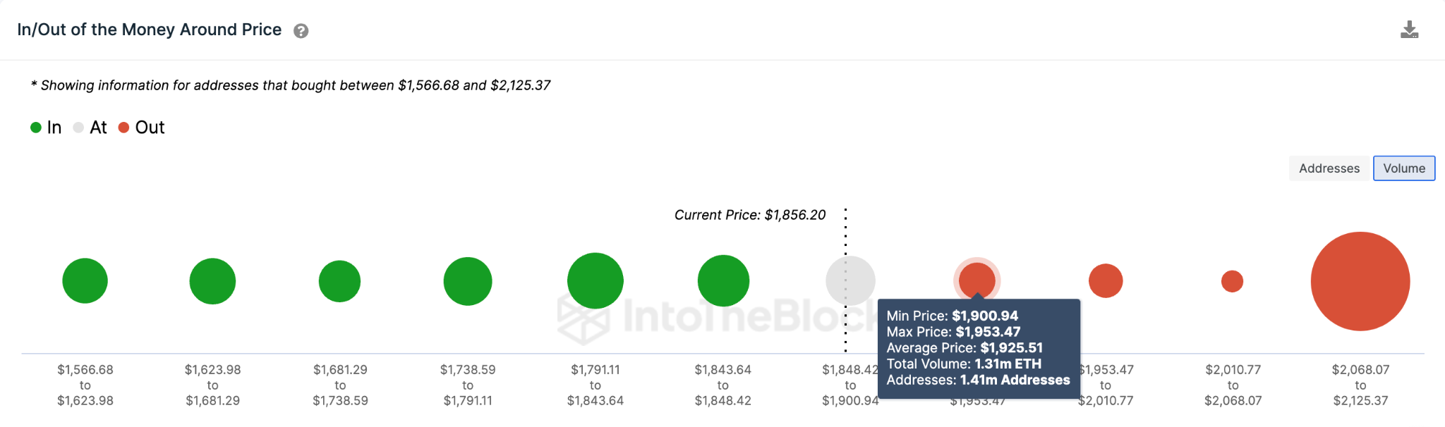 Данные платформы IntoTheBlock подтверждают возможность скорого возвращения ETH к $2 000. На пути к этой активу придется преодолеть сопротивление из 1,41 млн адресов, владеющих 1,31 млн монет по средней цене $1 925. Однако успешный прорыв выше этой области ускорит восходящий импульс и направит цену к $2 100.