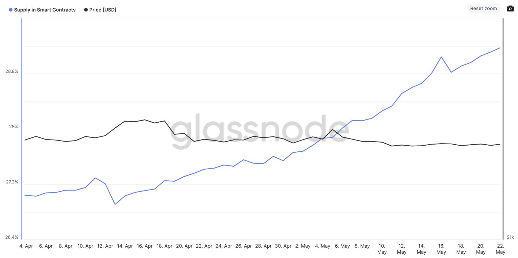 Метрика «Предложение в смарт-контрактах» (Supply in Smart Contracts) аналитической платформы Glassnode отслеживает процент циркулирующего предложения криптовалюты, который инвесторы заблокировали в различных DeFi-протоколах. Рост этого показателя вызывает временный дефицит предложения на рынке. Таким образом, если держатели Ethereum продолжат размещать токены в стейкинге, недавний скачок цены актива может перерасти в продолжительное бычье ралли.
