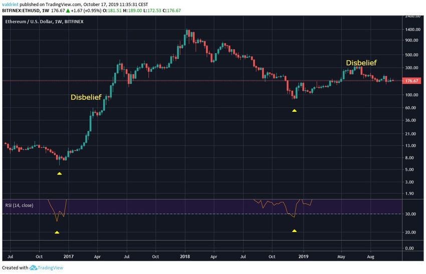 Если применить этот шаблон к курсу Ethereum, то можно предположить, что максимум, отмеченный в июне 2019 года, являлся частью фазы отрицания или «неверия» (Disbelief). Это означает, что рынок только что начал новый цикл. Если эти предположения верны, то в ближайшие два года нас может ожидать существенный рост цены.