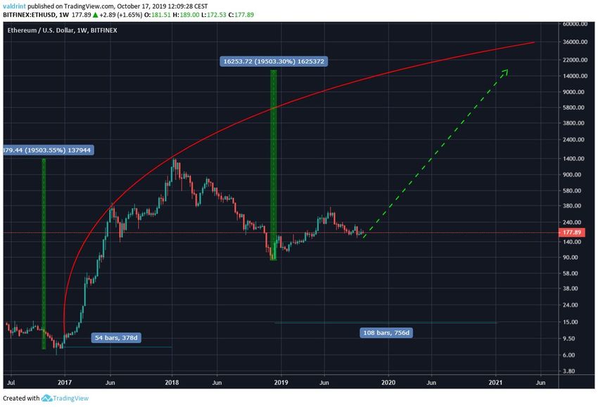 За фазу роста 2016-2018 гг., курс Ethereum вырос за 378 дней на 19500%.