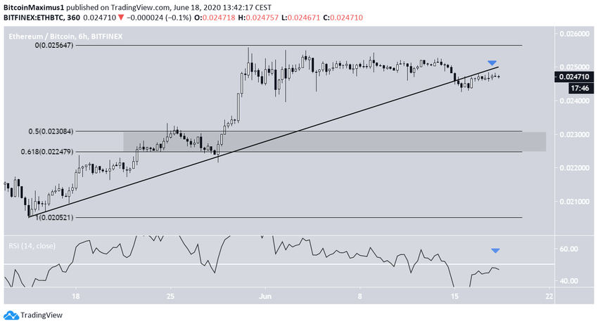 График ETH/BTC также обрисовывает медвежью картину. Пара совершила нисходящий пробой линии восходящей поддержки, которая сопровождала цену с 16 мая. Сейчас рынок пытается утвердить этот уровень в качестве сопротивления. Как и в случае с ETH/USD, индикатор RSI отскочил от области 50 и снижается.