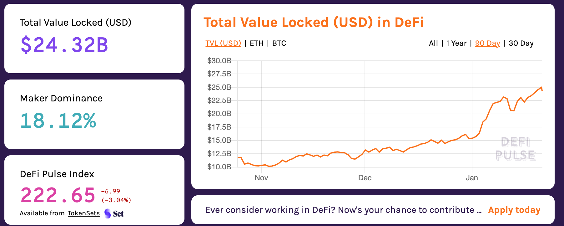С начала января рынок децентрализованных финансов вырос на 64%. На момент написания статьи общая стоимость средств, заблокированных в DeFi-протоколах (TVL) превышает 24 млрд долларов.