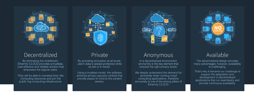 Видение Ethernity CLOUD для будущего облачных вычислений заключается в наличии четырех основных элементов: децентрализованность, приватность, анонимность и постоянная доступность.