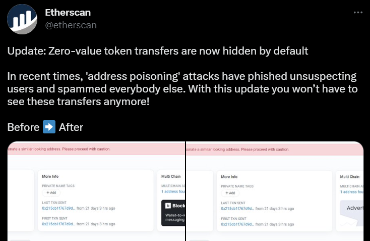 SponsoredНововведение призвано решить так называемую проблему «отравления адресов», когда мошенники отправляют жертвам нулевые переводы с целью ввести в заблуждение. Нововведение носит опциональную функцию и пользователи всегда могут вернуть отображение нулевых переводов в настройках сайта, отметили в Etherscan.