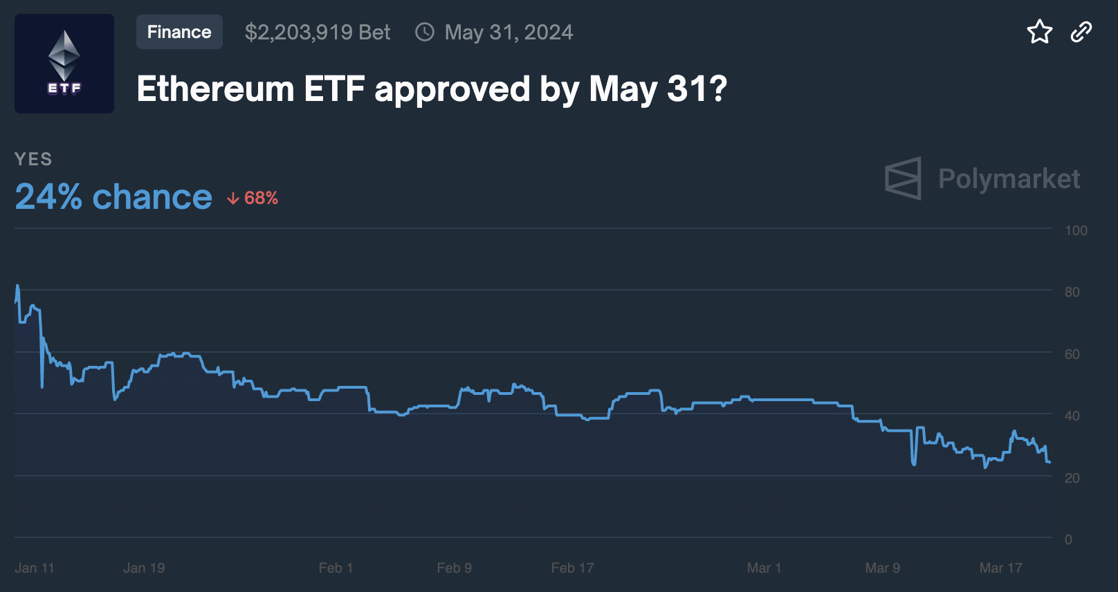 Еще в середине января Ethereum называли фаворитом на следующее одобрение спотовых ETF. Тогда в том же Bloomberg говорили о том, что новый инструмент на базе второй криптовалюты с 70%-й вероятностью одобрят уже этой весной.