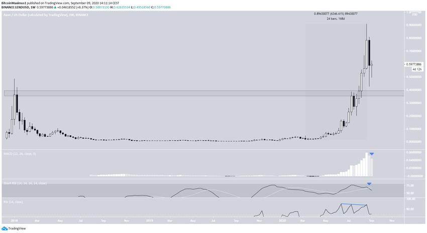 С начала марта LEND демонстрировал практически параболический подъем, который отправил цены к рекордному максимуму на отметке $0.90 26 августа. В общей сложности за 168 дней альткоин подорожал на 6361%.