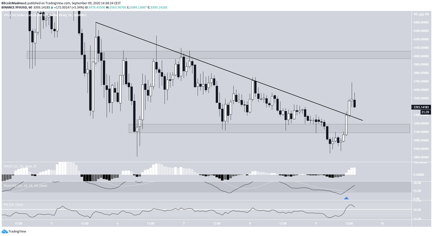 После резкого падения, DFI.Money (YFII) пробил линию нисходящего сопротивления и теперь движется в направлении ближайшего краткосрочного сопротивления.