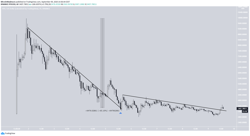 YFI показал аналогичный стремительный подъем, коснувшись максимума $9954 1 сентября. С тех пор цена снижается, подешевев уже на 65%.
