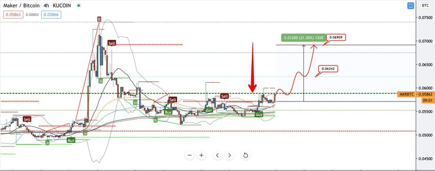 Альткоин Maker (MKR) пробил линию нисходящего сопротивления, превратив его в поддержку. Ожидается, что цена продолжит восхождение в направлении следующего барьера на отметке ₿0.095.