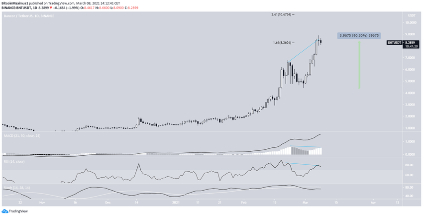 BNT также достиг 1,61 проекции Фибоначчи на уровне $8,26, откуда, вероятно, начнется коррекция.