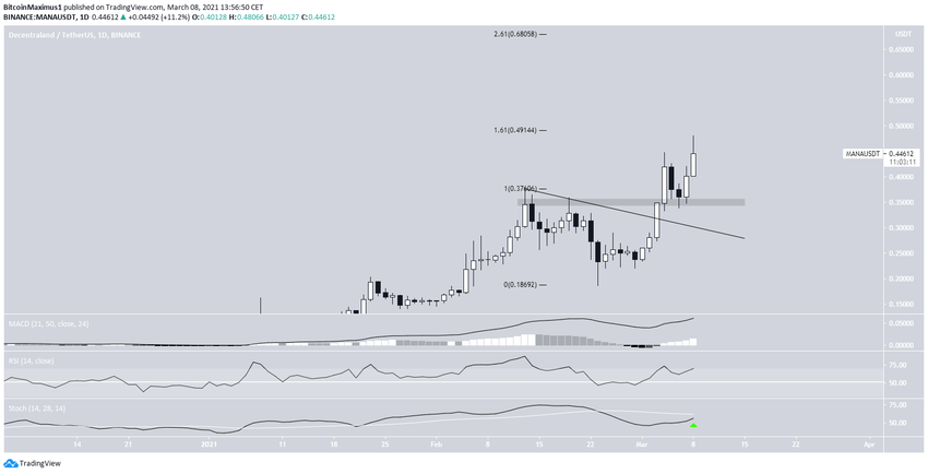MANA также достигла нового исторического максимума 8 марта и приближается к первой области сопротивления на уровне $0,49.