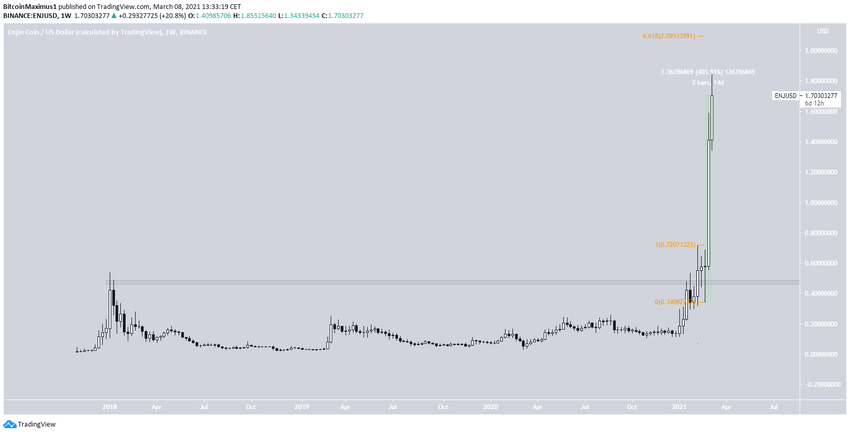 Курс ENJ стремительно рос с 23 февраля протестировал в качестве поддержки предыдущий исторический максимум. Сейчас он на 400% выше этого уровня.
