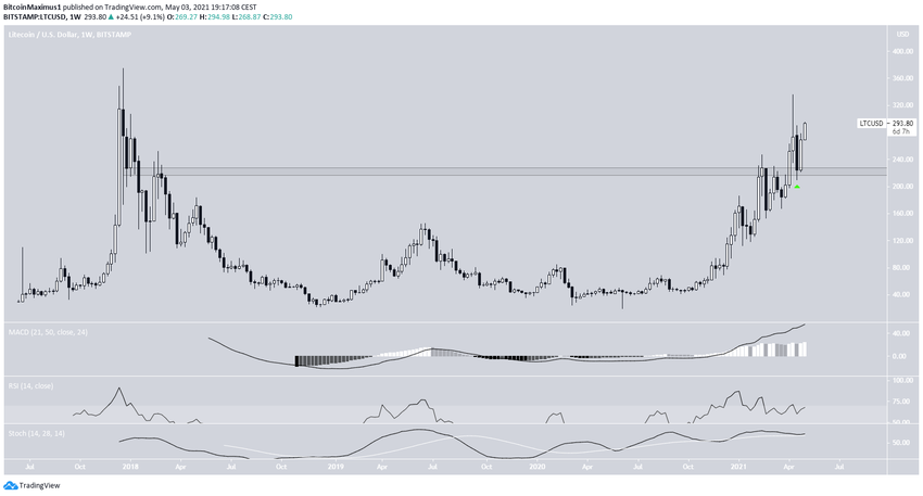 Недельный график показывает, что LTC пробил сопротивление на уровне $220 и затем протестировал его в качестве поддержки. Это произошло на последней неделе марта. Цена поднялась выше этого уровня впервые с начала 2018 года.
