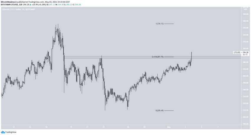 Картина на двухчасовом графике тоже указывает на возможность прорыва краткосрочного сопротивления. LTC готов переместиться выше $287. Это 0,618 коррекции Фибоначчи относительно недавнего падения. Рост выше этого уровня подтвердит развитие восходящей динамики как минимум в краткосрочной перспективе.