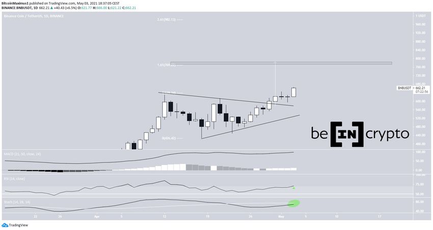 BNB достиг исторического максимума 12 апреля на уровне $638 и с тех пор торговался внутри симметричного треугольника. Цена совершила бычий прорыв 29 апреля и продолжила рост.