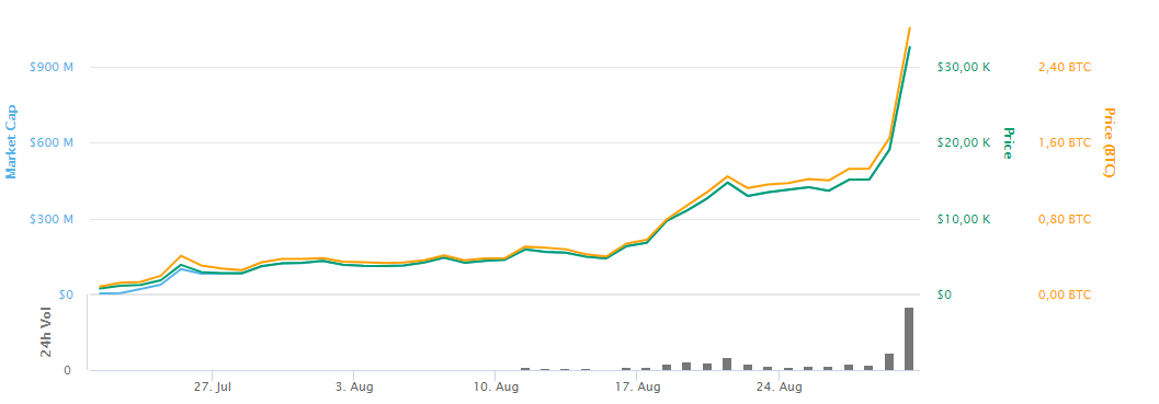 Вместе с токеном ЕТН продолжают расти в цене и монеты, созданные на его платформе. Так, один из самых популярных DeFi токенов YFI, который еще вчера стоит $20 000, всего за сутки подорожал до отметки в $32000. Токен Yearn.finance используется в качестве средства, с помощью которого можно получать доход от депозитов стейблкоинов, таких как USD Coin и Tether. Эта доходность стала настолько привлекательной для инвесторов, что сотни миллионов были перекачены в протокол Yearn.finance. Это увеличение депозитов привело к увеличению стоимости YFI, которая является показателем стоимости экосистемы Yearn.finance.